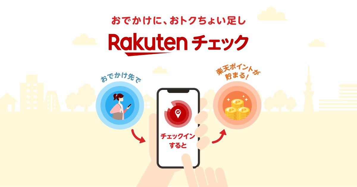 近くのお店や公園などでチェックインすると楽天ポイントが貯まる、毎日のおでかけをちょこっとおトクにするポイ活サービスです